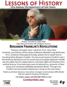 Sep 2025 26 The Lessons of History lecture "Benjamin Franklin's Revolutions" will be happening Sunday, October 12, at 5pm at the Cape May Co… Cape May MACRead More