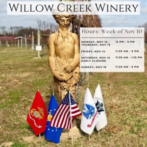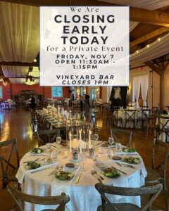 Nov 2025 7 We are closing early today, Friday, Nov 7 — last seating for reserved tables is at 1:15pm and the Vineyard Bar closes at 1pm Willow Creek WineryRead More