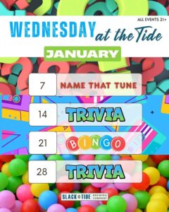 Jan 2026 5 Grab your friends and come hang out Wednesdays at the Tide for Name that Tune, Bingo and Trivia starting at 6PM Slack Tide Brewing CompanyRead More